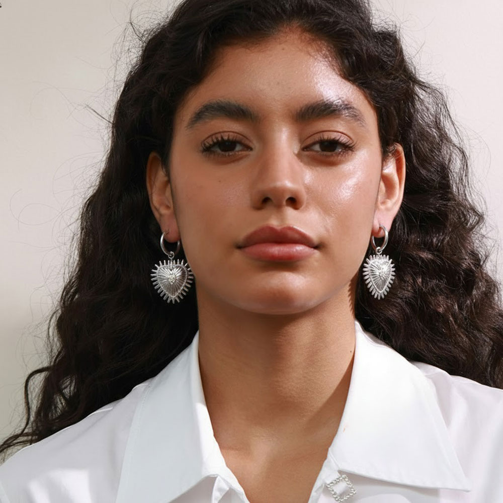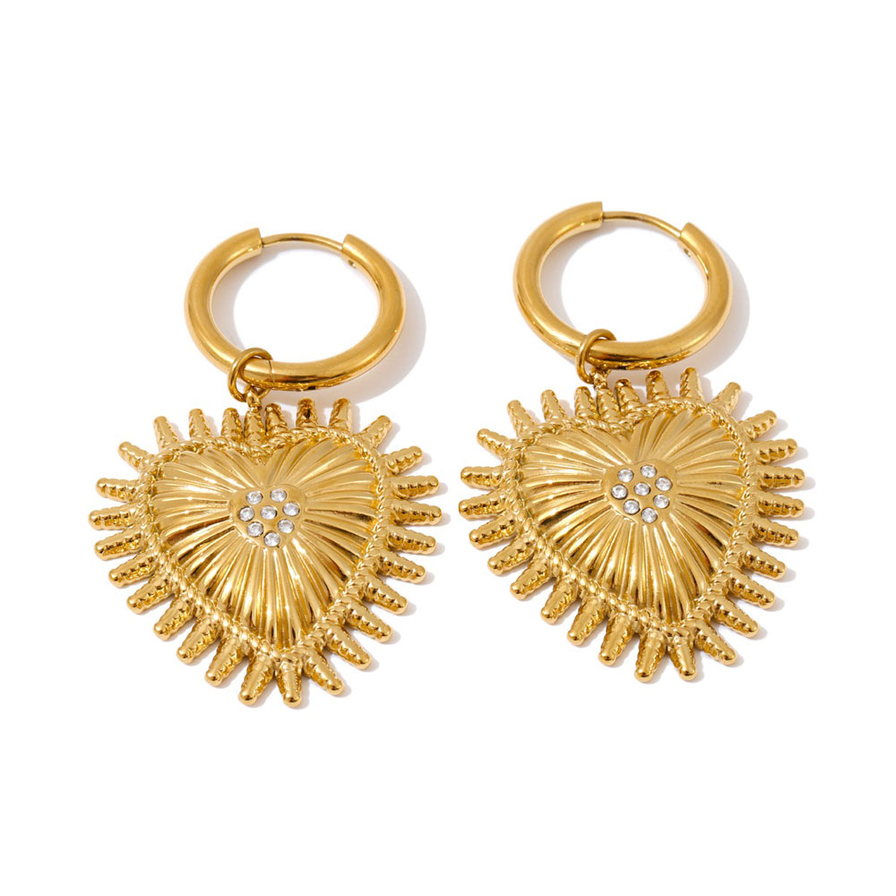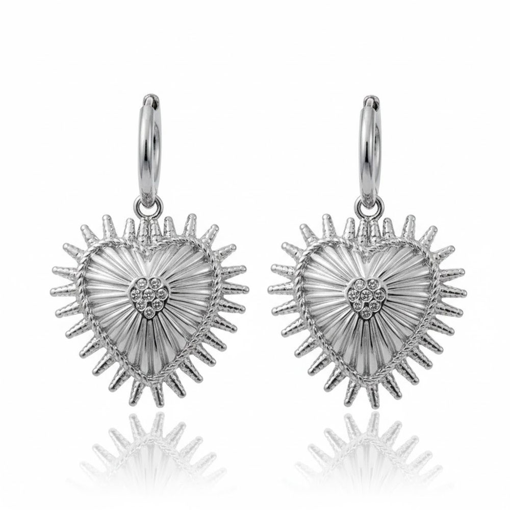 Κομψά ατσάλινα σκουλαρίκια με μικρό κρίκο και κρεμαστό στοιχείο καρδιάς που προσθέτει διακριτική κίνηση σε κάθε εμφάνιση. Ο ανάγλυφος σχεδιασμός και τα διακοσμητικά ζιργκόν αναδεικνύουν το κόσμημα, ενώ η κατασκευή από ανοξείδωτο ατσάλι τα καθιστά ιδανικά για καθημερινή χρήση με μοντέρνο χαρακτήρα. Κόσμημα από ανοξείδωτο ατσάλι δεν μπορεί σε καμία περίπτωση να υποστεί οξείδωση (σκουριά), δεν μαυρίζει ποτέ και ασφαλώς δεν δημιουργεί αλλεργίες (υποαλλεργικό). Μπορεί να φορεθεί καθημερινά και χωρίς κανέναν περιορισμό κάτω από οποιεσδήποτε συνθήκες π.χ. επαφή με νερό, ιδρώτα ακόμα και στην θάλασσα. Έτσι λοιπόν, ένα κόσμημα το οποίο είναι κατασκευασμένο από ανοξείδωτο ατσάλι είναι σίγουρο πως θα διατηρήσει για πάντα τη μοναδική λάμψη του.