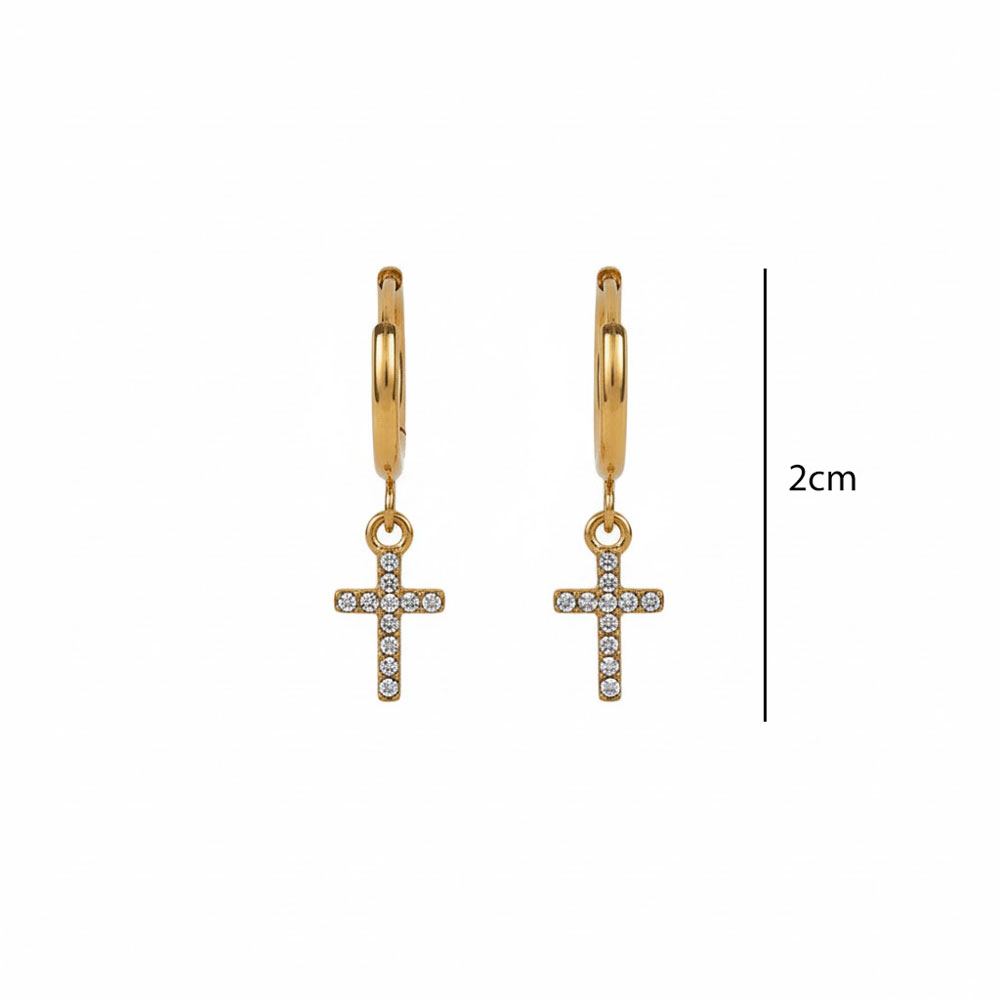 Κομψά σκουλαρίκια από ανοξείδωτο ατσάλι σε χρυσό χρώμα, με μικρό κρίκο και κρεμαστό σταυρό διακοσμημένο με λαμπερά στρας που χαρίζουν διακριτική λάμψη και φίνα κομψότητα. Ο συνδυασμός του κλασικού συμβόλου με τον minimal σχεδιασμό τα καθιστά ιδανική επιλογή για καθημερινές αλλά και πιο προσεγμένες εμφανίσεις. Ελαφριά και άνετα στη χρήση, με συνολικό μήκος περίπου 2 cm, ανθεκτικά και υποαλλεργικά, κατάλληλα για όλες τις ώρες. Κόσμημα από ανοξείδωτο ατσάλι δεν μπορεί σε καμία περίπτωση να υποστεί οξείδωση (σκουριά), δεν μαυρίζει ποτέ και ασφαλώς δεν δημιουργεί αλλεργίες (υποαλλεργικό). Μπορεί να φορεθεί καθημερινά και χωρίς κανέναν περιορισμό κάτω από οποιεσδήποτε συνθήκες π.χ. επαφή με νερό, ιδρώτα ακόμα και στην θάλασσα. Έτσι λοιπόν, ένα κόσμημα το οποίο είναι κατασκευασμένο από ανοξείδωτο ατσάλι είναι σίγουρο πως θα διατηρήσει για πάντα τη μοναδική λάμψη του.